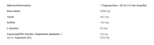 Zutaten: Wasser, Citrullin-Malat, Beta-Alanin, Säuerungsmittel (Zitronensäure), N-Acetyl-L-Tyrosin, Aroma, Koffein, Konservierungsstoffe (Kaliumsorbat, Natriumbenzoat), Niacin (Nicotinsäureamid), Süßstoffe (Sucralose, Acesulfam K), Farbstoff (Amaranth*)